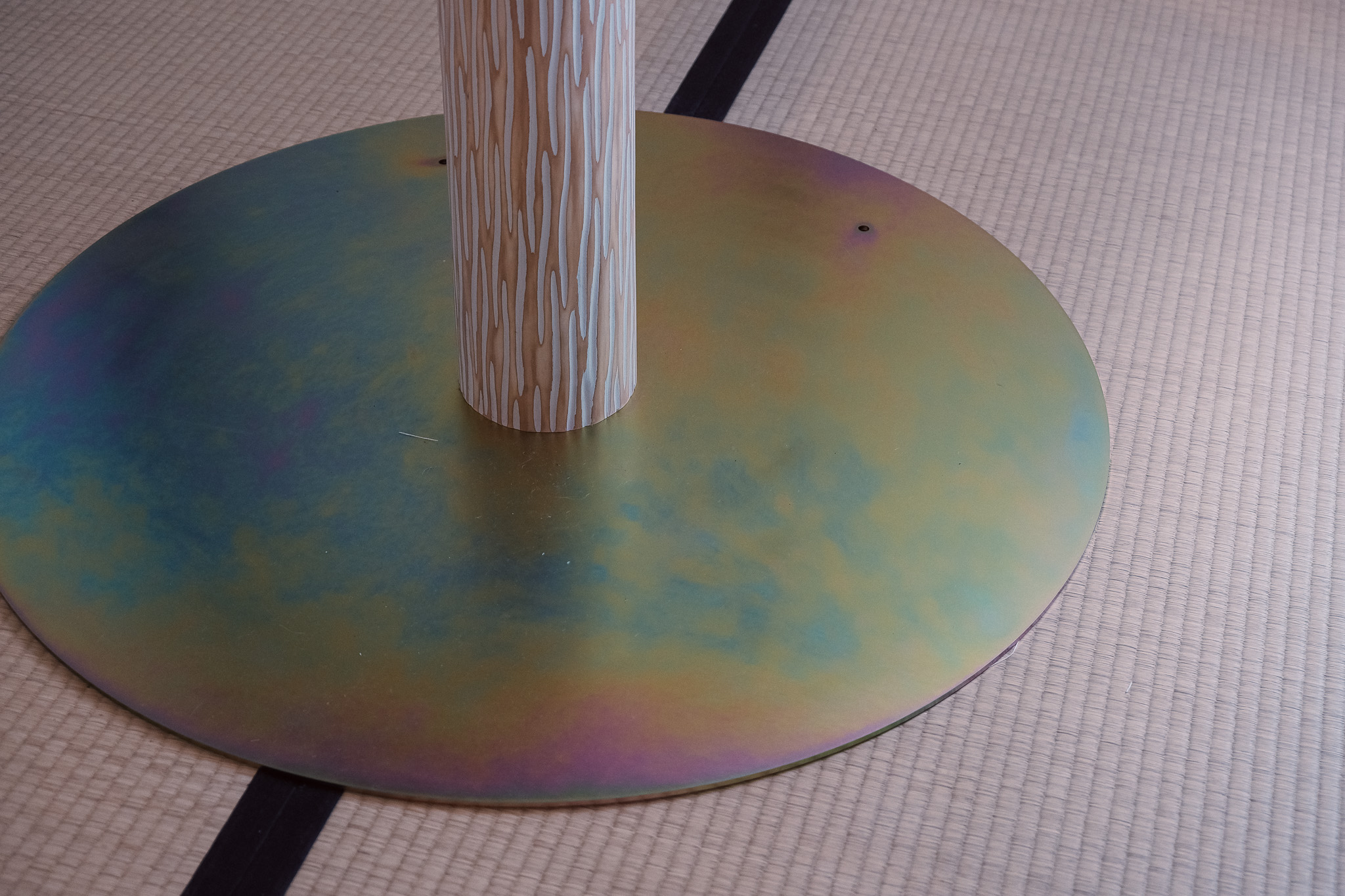 また底板、及び天板と丸太の接合面には、Φ900とΦ600の金属板を使用しています。この金属板は特殊なクロメート加工を施しており、見る方向・光の当たる方向によって表情を変える効果を持っています。この特殊クロメート加工は前述のカウンターのFRPと共鳴し、この二つの素材によって空間は朝昼夜、四季に寄り添い移ろいます。