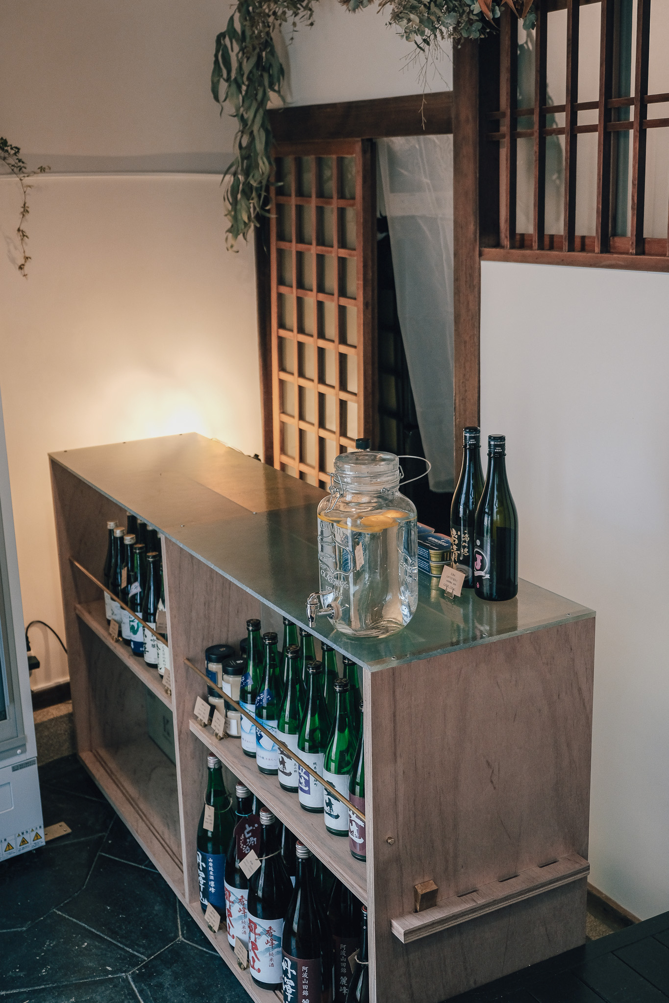 玄関空間で、接客及び立ち飲みができるカウンター兼日本酒のディスプレイ棚です。